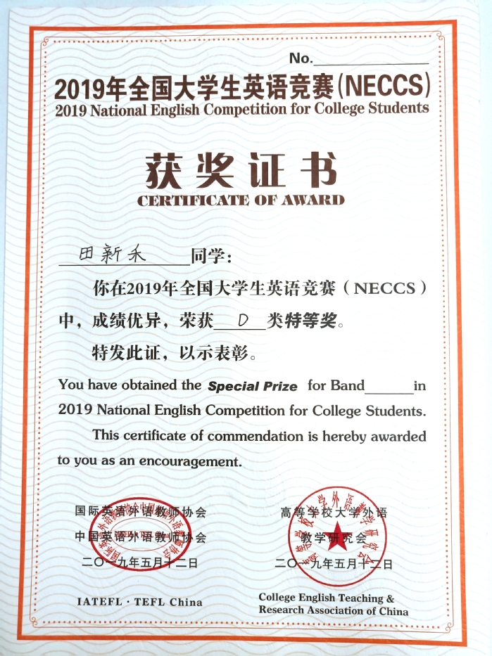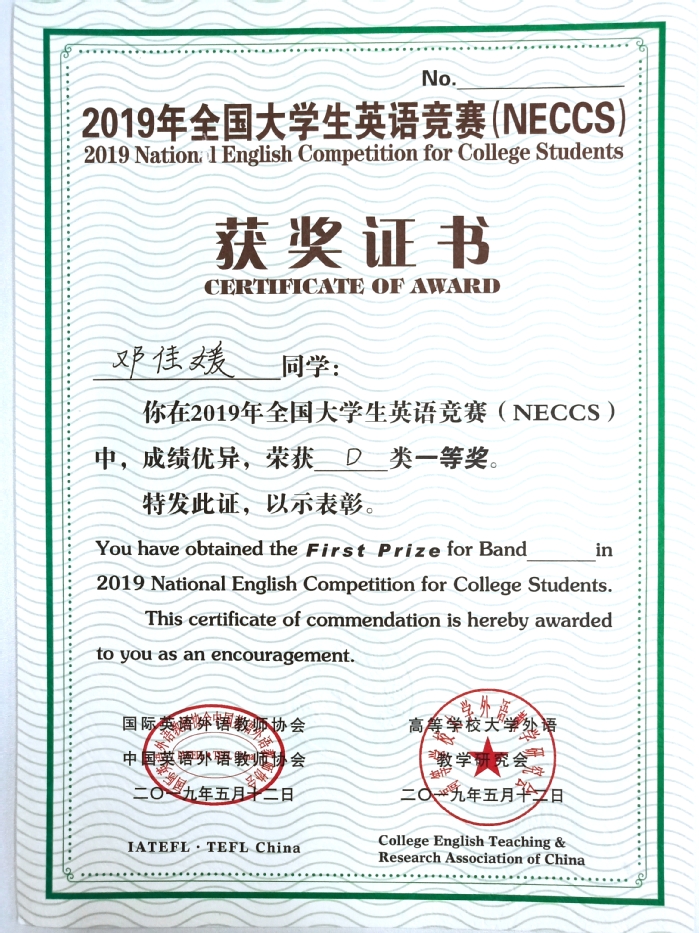 2019年全国大学生英语竞赛决赛成绩日前揭晓,我校设计学院田新禾同学荣获D类“特等奖”,文化产业学院邓佳媛同学荣获D类“一等奖”。 此外,在初赛中,我校共有26名学生获奖,其中,D类“二等奖”10名,D类“三等奖”16名。近年来,我校英语教学将教材的语言材料与艺术相融合,为艺术生营造出浓厚的外语学习氛围,并鼓励学生积极投身课堂之外的学习活动,在历年的全国大学生英语竞赛中皆荣获优异的成绩。 全国大学生英语竞赛(NECCS)是经教育部有关部门批准并委托教育部高等学校大学外语教学指导委员会和高等学校大学外语教学研究会联合主办、全国唯一的大学生英语综合能力竞赛活动,是我国高校英语教学的一项重要的评价手段和激励机制,对于落实《国家中长期教育改革和发展规划纲要(2010-2020年)》和高校教学水平评估有关大学各类英语教学的各项指标,全面提高高校英语学科地位和英语教学水平有重大的促进作用。本竞赛分A、B、C、D四个类别,A类适用于研究生参加;B类适用于英语专业本、专科学生参加;C类适用于非英语专业本科生参加;D类适用于艺术体育类本科生和非英语专业高职高专类学生参加。竞赛四个类别均设四个奖励等级:特等奖、一等奖、二等奖和三等奖。初赛产生:决赛入围资格、二等奖和三等奖。决赛产生:特等奖和一等奖。 (人文学院 外语教学部) 附件:获奖学生名单及指导教师