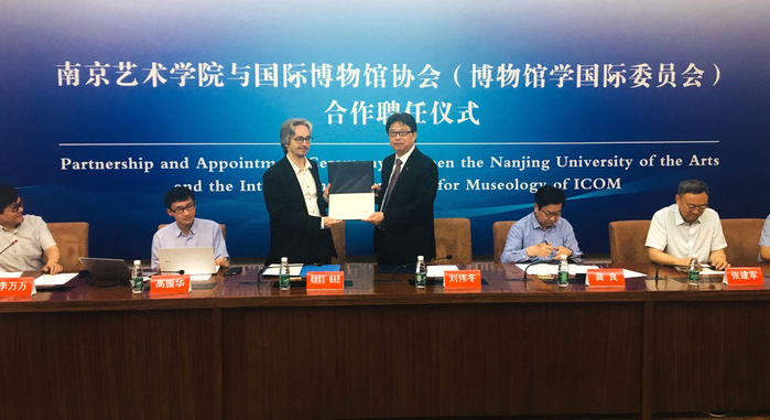 7月7日上午,南京艺术学院与国际博物馆协会(博物馆学国际委员会)合作聘任仪式在校举办。在国内知名博物馆馆长、专家及媒体嘉宾的见证下,南京艺术学院院长刘伟冬与国际博物馆协会(博物馆学国际委员会)主席弗朗索瓦·梅来思(François Mairesse)代表双方签署合作协议,梅来思主席被正式聘任为南京艺术学院国际艺术博物馆学院名誉院长及客座教授,刘伟冬院长向其颁发了聘书。 此次签约,意味着南艺国际艺术博物馆学院建设得以加速推进。南京艺术学院和国际博物馆协会将从国际博物馆人才培养、博物馆学科创建、博士及博士后项目、文献中心、著作翻译与出版、学术会议、联合国教科文组织教席项目等方面着手合作,加快推动国际博物馆信息中心、“博物馆前景——博物馆多样性及其演化研究联合国教科文组织教席”等项目的落实推进。 为促进博物馆学科在中国的发展, 2018年1月25日,南京市委宣传部、南京艺术学院与国际博物馆协会(博物馆学国际委员会)签署了《关于成立“国际博物馆信息中心”的合作备忘录》与《关于成立“国际艺术博物馆学院”的合作备忘录》,发起成立国际艺术博物馆学院,并在学院框架内成立国际博物馆信息中心。 为建立起全球博物馆及博物馆学数据采集与分析研究网络,梅来思主席所在的巴黎新索邦大学与南京艺术学院、加拿大魁北克大学蒙特利尔分校、巴西里约热内卢联邦大学合作,于2018年4月共同向联合国教科文组织申请成立“博物馆前景——博物馆多样性及其演化研究联合国教科文组织教席”。 作为国际博物馆信息中心的国际合作框架,“博物馆前景”联合国教科文组织教席将于2020年2月举办中国(南艺)揭幕仪式。作为配套项目,还将举办一次“国际博物馆学日”活动。“国际博物馆学日”将使中外学者和从业者得以分享其就博物馆前景问题的当前研究和对未来的展望。众多与博物馆有关的国际组织代表将受邀参加揭幕仪式及研究日活动并发表演讲。 值得一提的是,作为国际博物馆信息中心首个成果和首次发布内容,《博物馆领域与博物馆学信息中心与资源中心综述报告》将在揭幕仪式之机通过新华网以五种语言向全球权威发布。(转自交汇点新闻) 刘伟冬院长向国际博物馆协会主席弗朗索瓦·梅来思颁发聘书 |