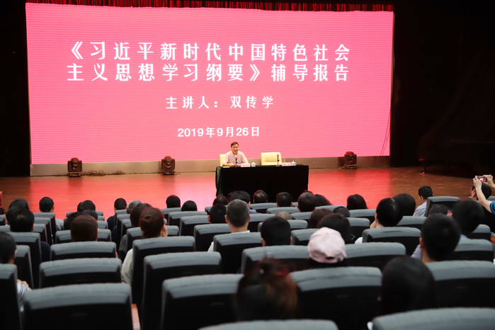 9月26日下午,按照“不忘初心、牢记使命”主题教育学习安排,我校举行《习近平新时代中国特色社会主义思想学习纲要》(以下简称《学习纲要》)辅导报告,邀请新华日报社党委书记、社长,新华报业传媒集团董事长双传学教授主讲。报告会由学校主题教育领导小组组长、党委书记杨明主持。校领导,校党委常委、两委委员出席报告会。 双传学阐述了编写《学习纲要》的重要意义。他指出,编写《学习纲要》是加强党的理论建设的一项基础工程,也是推进思想建党、理论强党的内在要求。《学习纲要》的正式出版,意味着我们对习近平新时代中国特色社会主义思想的学习宣传、贯彻落实进入了新的阶段,必将把新思想的学习进一步引向深入,必将对我们的实际工作产生新的强大推动力。双传学认为,《学习纲要》具有忠于原文、体系严整、提纲挈领、生动朴实等四个鲜明特点。就如何学习领会《学习纲要》内容结构和深刻理解新思想精髓要义,双传学提出要把握好“新时空”“大文章”“中国梦”“软实力”“方法论”五个关键词。他强调,要从新的国际国内形势变化、新的技术革命带来的社会变化、新的历史特点的伟大斗争、实现国家治理体系和治理能力现代化新目标这四个“新”来理解新思想形成的新的时空背景。双传学指出,坚持和发展中国特色社会主义是贯穿于《学习纲要》和新思想的一条重要主线,我们这一代共产党员要把坚持和发展中国特色社会主义这篇“大文章”写好,就要从改革开放40多年中国特色社会主义发展历程、从新中国成立以来70年的奋斗历程、从中国近代以来近180年的历史发展、从科学社会主义诞生发展的500多年历程、从中华文明5000年历史进程这五大视角来理解中国特色社会主义。在谈到“中国梦”时,双传学指出,“中国梦”激发了中国共产党的理论创造力和现实想象力,切实增强了人民群众对中国特色社会主义事业的参与感、自豪感和获得感,也让世界对中国的认识有了比较好的切入视角。他强调,实现中华民族伟大复兴的“中国梦”,要闯过市场经济关、民主政治关、国家治理关、利益调整关、党的建设关、网络治理关等六个重要关口。在谈到“软实力”时,双传学强调要把握好软实力与社会主义意识形态的关系、软实力与价值观自信的关系、软实力与中华优秀传统文化的关系。关于“方法论”问题,双传学提出要提高战略思维、历史思维、辩证思维、创新思维和底线思维五大能力。 杨明在总结讲话中代表学校对双传学社长的精彩辅导报告表示感谢。他指出,双传学社长以深厚的理论功底,严密的逻辑思维,基于对《学习纲要》的深刻理解,从《学习纲要》的重大意义、内容结构和精髓要义等方面作了一场很好的辅导报告,这对于学校党员师生全面、系统、深入地学习和领会《学习纲要》具有十分重要的帮助。杨明强调,双传学在报告中还结合南艺的工作特点和工作任务,根据习近平新时代中国特色社会主义思想为我们学校事业高质量发展的着力点提出了很好的建议。当前,学校正在按照中央和省委统一部署,开展第二批“不忘初心、牢记使命”主题教育,广大党员师生要原原本本通读《学习纲要》,进一步学懂弄通做实习近平新时代中国特色社会主义思想,切实为学校事业高质量发展作出更大贡献。 全校中层干部、党支部书记、主题教育领导小组办公室成员和部分师生党员听取了报告。(宣传部)