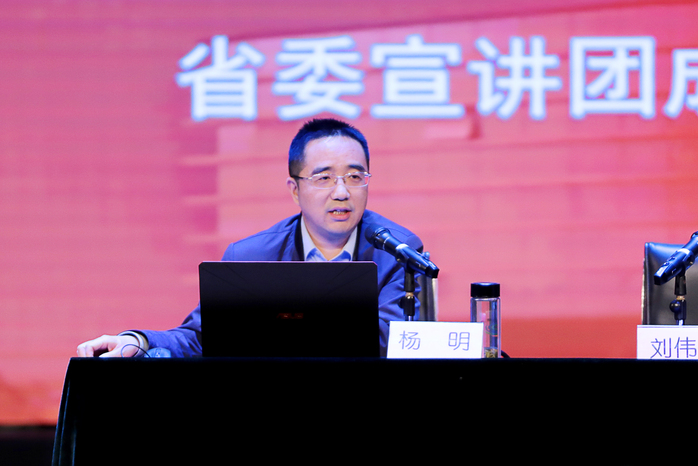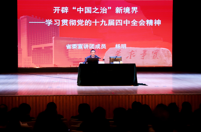 为深入学习宣传贯彻党的十九届四中全会精神,用全会精神武装全体党员干部和广大师生头脑、指导学校高质量发展新实践,根据省委宣讲团的统一部署,11月20日下午,我校在南艺剧场举行党的十九届四中全会精神宣讲会。省委宣讲团成员、校党委书记杨明作宣讲报告。校党委副书记、院长刘伟冬主持。省委宣传部领导,我校全体校领导、党委常委,科级以上干部,校第十次党代会代表以及部分学生党员代表听取了报告。 杨明以《开辟“中国之治”新境界》为题,从全会的基本情况和重大意义,坚定中国特色社会主义制度自信,坚持和完善中国特色社会主义制度、推进国家治理体系和治理能力现代化的总体要求、总体目标和重点任务等方面对全会精神作了全面准确的解读。他指出,党的十九届四中全会是一次具有开创性、里程碑意义的重要会议。首次用一次中央全会专题研究坚持和完善中国特色社会主义制度、推进国家治理体系和治理能力现代化,并审议通过《中共中央关于坚持和完善中国特色社会主义制度、推进国家治理体系和治理能力现代化若干重大问题的决定》,充分体现了以习近平同志为核心的党中央高瞻远瞩的战略眼光和全面建设社会主义现代化国家、确保党和国家长治久安的历史担当。 杨明指出,《决定》全面总结了中国特色社会主义制度发展的历史性成就,集中概括了我国制度和治理体系的显著优势,深刻阐述了支撑中国特色社会主义制度的根本制度、基本制度、重要制度,明确了坚持和完善中国特色社会主义制度、推进国家治理体系和治理能力现代化的总体要求、总体目标和重点任务,对新时代坚持和完善中国特色社会主义制度、推进国家治理体系和治理能力现代化具有定纲指向的重大意义。在谈到坚持中国特色社会主义制度自信时,杨明从中国制度和国家治理体系的深厚历史底蕴、显著优势、实践成果等三个维度,引经据典、高屋建瓴,深刻分析了坚定“制度自信”的历史逻辑、理论逻辑和实践逻辑。他说,制度自信是其他三个自信的集中体现,是坚定“四个自信”的底气和信心所在。 杨明强调,深入学习贯彻四中全会精神,要毫不动摇坚持和巩固、与时俱进完善和发展中国特色社会主义制度和国家治理体系,严格遵守和执行制度。就我们南艺来说,全体党员干部要进一步坚定“制度自信”,坚持社会主义办学方向,始终把纪律和规矩挺在前面,将学校事业高质量发展的战略导向和办学治校应当遵循的各项制度真正落实落地,努力把南艺的事办好。 刘伟冬在主持时指出,全校党员干部要把学习宣传贯彻四中全会精神与深入学习贯彻习近平新时代中国特色社会主义思想紧密结合起来,与开展“不忘初心、牢记使命”主题教育紧密结合起来,当好学习标兵、做好本职工作,推动党的十九届四中全会精神入脑入心、落地生根。他强调,要把四中全会精神运用到我校正在进行的制度“废改立”工作中去,进一步加强党对学校工作的全面领导,进一步推进中国特色社会主义大学制度建设,进一步完善构建学校事业高质量发展“六大体系”的体制机制,为我校事业高质量发展提供科学完备的制度保障,推动学校党的建设和办学治校水平再上新台阶。 杨明书记的报告会,在与会党员干部和青年学子中引起了热烈反响。“杨书记以高度的政治站位、深厚的哲学智慧、丰富的人文底蕴,为我们深刻地解读了全会精神”,工业设计学院党总支书记庄丽说:“作为基层党务工作者,要更加自觉将全会精神贯彻落实到各项工作中,坚持立德树人根本任务,培养更多社会主义建设者和接班人。”人文学院党总支书记陈勇军表示,将结合“不忘初心、牢记使命”主题教育认真贯彻落实全会精神,组织党员干部联系工作实际对标找差,解决好在推进学院自身发展方面存在的突出问题。对第十三届社团联合会主席、2016级音乐传播专业的张宇同学来说,杨书记的报告让她更加坚定了中国特色社会主义“四个自信”,她将努力发挥学生党员的模范带头作用,用实际行动践行好全会精神。“作为一名广编专业的大学生,要努力用专业所学讲好中国故事、传播中国声音,做一名具有社会责任感和家国情怀的有志青年。”南艺官微副总编、2017级广播电视编导专业的朱冰清同学激动地说。(宣传部) |