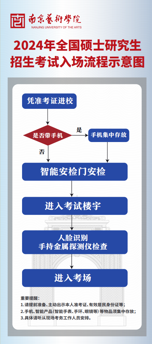 3.考试期间本考点禁止校外车辆和考生亲友进入校园,建议考生乘坐公共交通,避免因停车困难、交通拥堵等影响考试。 三、考试入场及相关规定 1.考前材料准备 考生不得携带手机、电脑、iPad、电子书、其它带通话及拍照功能的电子产品、智能手表、耳机、移动硬盘等违规物品进入考试封闭区域。考生不得携带具有通讯功能的工具(如手机、智能手表、智能眼镜和照相、扫描等设备)或有存储、编程、查询功能的电子用品进入考场。 出发前请认真清点考试所需携带的物品:准考证、有效居民身份证、黑色字迹签字笔、铅笔、无封套橡皮及准考证上注明所需携带的用具。考场内不得自行传递文具、用品等。建议使用透明文具袋将所有物品集中存放。 2.入场时间 因学校校门与考场所在楼宇有一定距离,且增加了智能安检门及手机集中存放等相关安检环节,请考生预留充足时间,建议考试当天至少提前1小时到达考点,并按要求有序入场。 3.入场流程 为有效防范手机等高科技作弊,确保“平安研考”,根据教育部统一要求,南京艺术学院考点2024年研招考试配备了智能安检门,并在考场所在楼宇入口外区域设置手机集中存放点。考生应主动按考点要求和指示,提前至手机集中存放区域将手机等具有通讯功能的工具进行存放。具体流程见入场流程图。