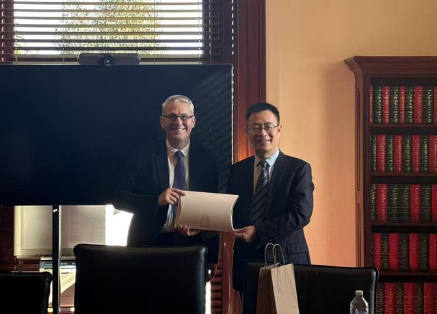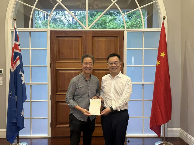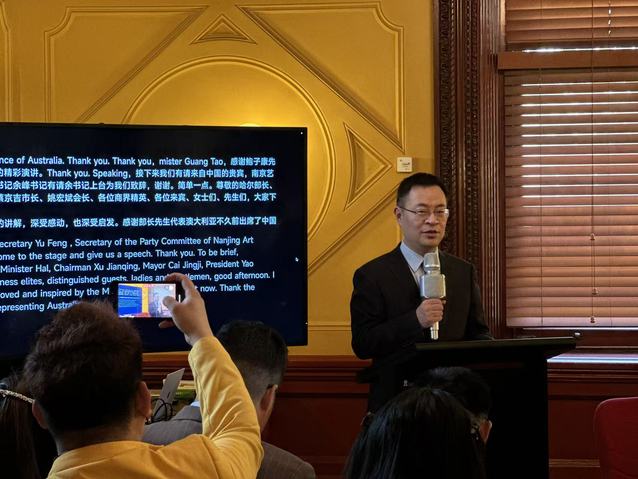 在墨尔本,俞锋拜访了中国驻墨尔本总领事馆,与总领事房新文、教育参赞丁莉等就进一步加强中澳人文艺术交流进行了广泛而深入的探讨。房新文指出,总领馆将全力支持南艺与澳洲高校在人文艺术领域的深度合作,特别期待双方未来在汉字艺术设计展、中国传统民族音乐演出等能够充分彰显文化自信、促进文明对话的项目上结出硕果,共同绘制中澳文化交流精谨细腻的“工笔画”,为两国关系的繁荣发展增添绚丽的艺术色彩。