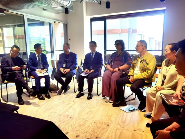 与中国驻澳使领馆的系列会晤,为南艺的国际化合作打开了更广阔的空间。南艺主动将学校发展融入国家外交大局,使艺术教育交流成为传递中国声音、讲好中国故事、展现可信可爱可敬中国形象的重要平台,展现了百年艺术学府在新时代公共外交与国际文化传播中的使命与担当。 国之交在于民相亲,民相亲在于心相通。南艺代表团还与澳各级政府官员广泛接触。 在悉尼,俞锋即与澳大利亚联邦政府多元文化委员会全国委员、新南威尔士州政府多元文化委员会主席陈建青会面,双方就推动艺术家驻留计划、联合交流展出、特别是新南威尔士州与江苏省共建国际级多元文化中心等具有前瞻性的议题达成了初步合作意向,为省州友好合作注入了丰富的艺术内涵。