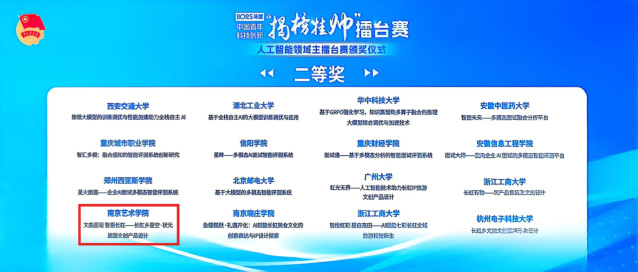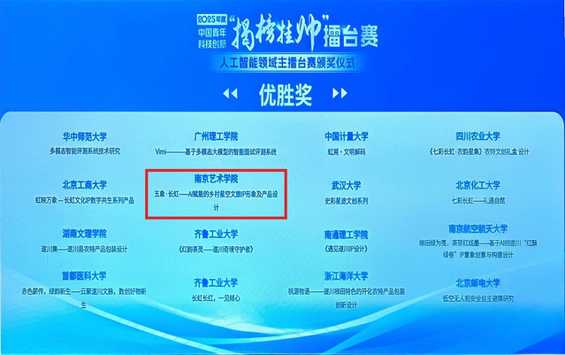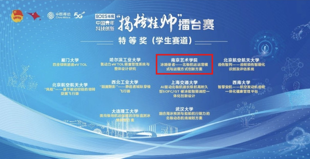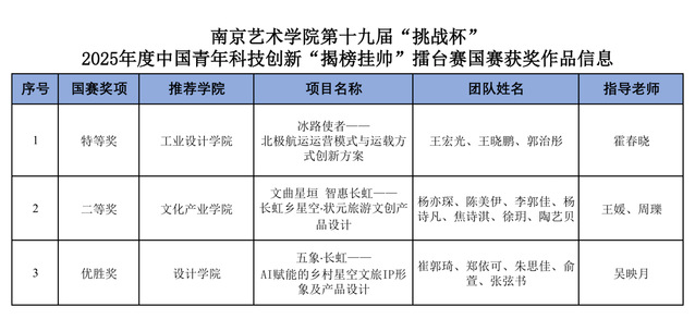 我校今年首次参加“揭榜挂帅”擂台赛并获得优异成绩。10月12日至14日在湖南省长沙市举办的“高端装备领域”主擂台赛中,工业设计学院《冰路使者——北极航运运营模式与运载方式创新方案》项目荣获特等奖;10月17日至20日在上海市徐汇区举办的“人工智能领域”主擂台赛中,文化产业学院《文曲星垣 智惠长虹——长虹乡星空·状元旅游文创产品设计》项目荣获二等奖;设计学院《五象·长虹——AI赋能的乡村星空文旅IP形象及产品设》项目荣获优胜奖。突破性成绩充分彰显我校青年学子立足国家战略、勇闯科创前沿的时代担当,展现了艺术创新赋能科技攻关的独特价值。