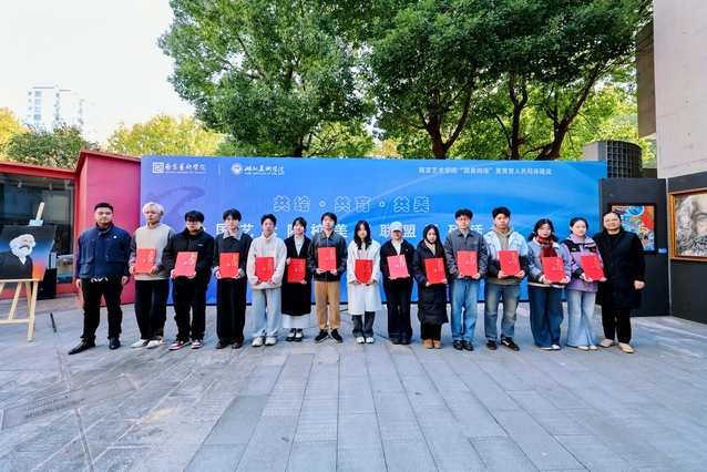11月21日上午,南京艺术学院与湖北美术学院作品联展在我校马克思阅读中心广场开幕。本次展览作为全国艺术院校美育联盟系列活动之一,以“时代与信仰的交响——‘艺馨向党画说马克思’与‘可亲可敬可爱的中国形象’”为主题,汇聚两校师生三百余幅作品,以艺术为媒介,共绘马克思主义中国化时代化的生动图景,为新时代美育实践注入澎湃活力。我校党委书记俞锋出席活动并宣布展览开幕。湖北美术学院党委副书记朱丽莎,我校党委常委、副校长邓硕致辞,师生代表刘九鸣、范荣泽先后发言。开幕式由我校美术与书法学院党委书记陈勇军主持。