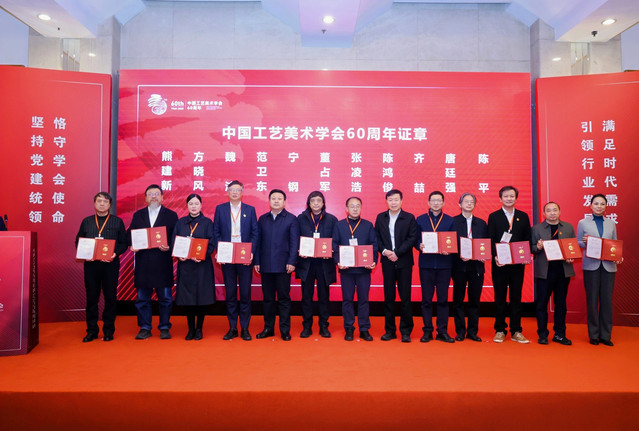 2025年12月21日,中国工艺美术学会成立60周年大会在北京隆重召开。大会汇聚了行业精英、专家学者及各界代表,既是对学会一甲子砥砺前行的发展历程的全面回望,更是对工艺美术行业未来航向的战略擘画与精准导航。我校校长、中国工艺美术学会设计专业委员会主任张凌浩出席会议,获颁“中国工艺美术学会60周年证章”并发表主题演讲。 原文化部党组副书记、副部长赵少华,中国科协中国国际科技交流中心副主任陈锐,工业和信息化部工业文化发展中心主任何映昆,中国机械联合会党委书记、会长、中国工艺美术协会会长徐念沙,中国工艺美术馆、中国非物质文化遗产馆党委书记王晨阳,清华大学美术学院党委书记覃川,人力资源和社会保障部原党组副书记、副部长杨志明等领导嘉宾莅临大会并发表致辞。大会由中国工艺美术学会党委书记、理事长才大颖主持。