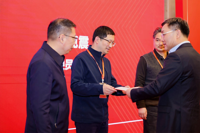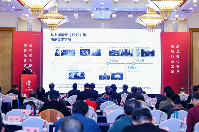 中国美术馆馆长潘义奎向张凌浩(右起第5位)颁发证章 值此学会成立60周年之际,南京艺术学院在上级领导的关心支持下,牵头成立中国工艺美术学会设计专业委员会。该专委会以整合全国工艺美术大师资源与设计学科力量为核心,致力于通过跨界融合与创新实践,推动当代工艺美术与科技、文化深度融合。专委会由南京艺术学院设计学院具体承办,下设秘书处及现代手工艺研究中心、苏州手工艺研发中心,将联合国内多所美术院校及行业骨干力量,构建产学研协同创新发展的高端平台。 大会期间,张凌浩校长在中国工艺美术学会五届七次理事会暨五届第十三次常务理事会上正式接受中国工艺美术学会设计专业委员会主任聘书,并发表题为“设计引领手工艺走向未来”的主题演讲。他系统梳理了南京艺术学院从1912年上海美专起步,历经一个多世纪风雨洗礼与薪火相传,在工艺美术领域积淀的深厚底蕴与丰硕创新成果,并详细阐述了设计专委会未来在学术研究深化、专业人才培养、产业成果转化等方面的重点工作计划,为专委会发展勾勒出清晰蓝图。