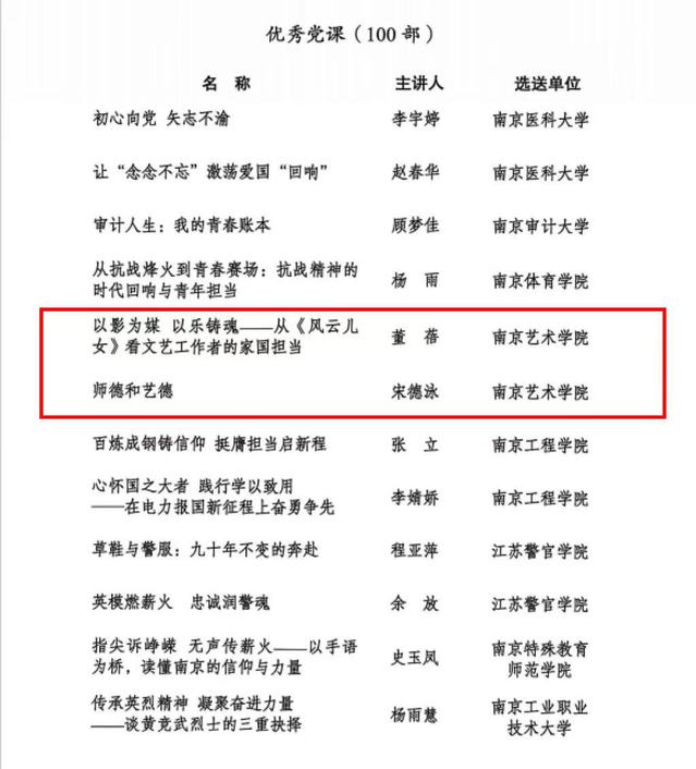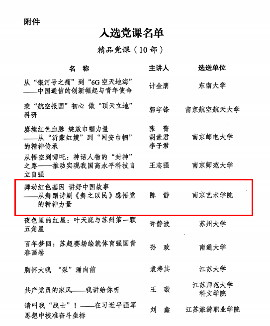 此次观摩交流活动由中共江苏省委组织部、省委教育工委组织开展,旨在推动高校党员经常性教育走深走实。活动共推出“精品党课”10部、“优秀党课”100部。其中,我校陈静老师的党课《舞动红色基因讲好中国故事——从舞蹈诗剧<舞之以民>感悟党的精神力量》获评“精品党课”;宋德泳老师的党课《师德和艺德》、董蓓老师的党课《以影为媒以乐铸魂——从<风云儿女>看文艺工作者的家国担当》获评“优秀党课”。三项获奖作品紧扣“铸魂育人 青春向党”主线,将党的创新理论与艺术实践、专业思考深度融合,充分展现了我校师生党员以艺通心、向党而行的专业素养和昂扬风貌。 |