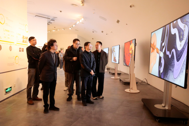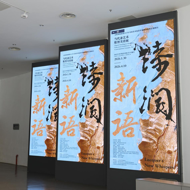 展览的学术支持单位代表、江苏省青年美术家协会漆画艺委会主任周军南致辞 周军南表示,本次展览突破传统展陈边界,策展团队运用AI数据挖掘与图像还原技术,系统梳理并呈现了从先秦至清代横跨八千年的中华漆艺发展图谱,让观众在数字维度中清晰感知漆艺的演变脉络。展览以“数智美育”为核心,推动传统漆艺与人工智能、虚拟现实技术的深度融合。参展作品既展现了青年艺术家对髹饰技法的深耕,也体现出对城市记忆、生态关怀等当代议题的敏锐洞察。值得一提的是,特邀展区汇聚全国二十位青年漆艺家,配套社区活动与中小学美育实践,打破艺术圈层壁垒,让漆艺回归生活现场。