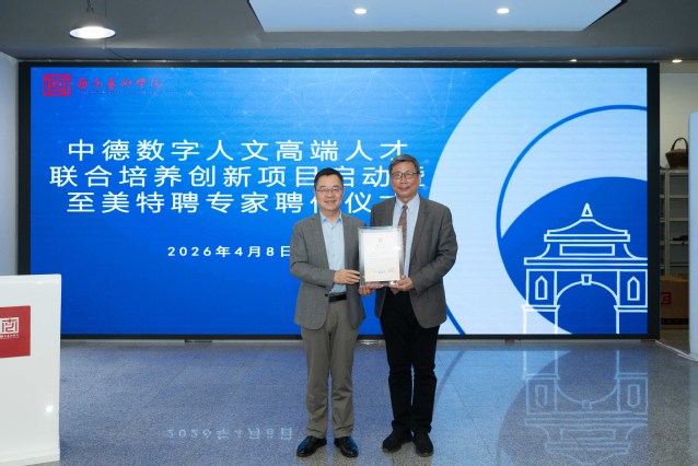 4月8日,中德影像与数字人文研究中心国际人才培养项目启动暨至美讲席教授聘任仪式在南艺传媒学院资料室举行。校党委书记俞锋,副校长张捷,复旦大学教授、博士生导师孟建,校科研处处长王方,传媒学院领导班子成员及师生代表参与活动。仪式由传媒学院院长薛峰主持。
