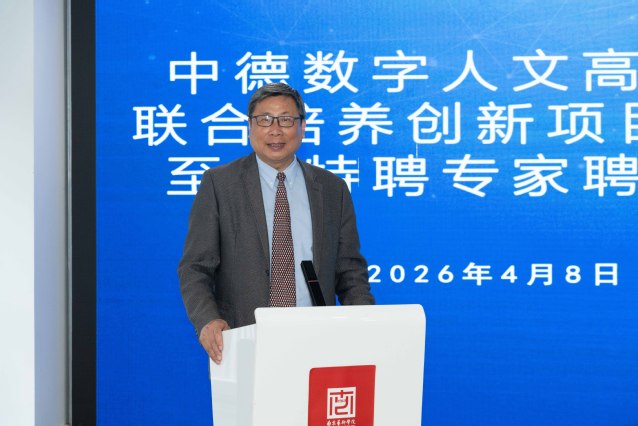 孟建教授在致辞中感谢南京艺术学院的信任与厚爱。他回顾四十余年教学生涯,作为1977级的大学生,曾在南京多所院校与单位工作。此次重回南京、加盟南艺让他倍感亲切。他表示,南艺学科齐全、实力雄厚,能在此任教是莫大荣幸。面对新时代高等教育发展机遇与挑战,他将以空杯心态虚心学习、携手前行,以饱满热情投入工作。他将充分发挥学术优势,为中德数字人文项目建设、学科发展与人才培养贡献力量,与学校共同推动数字人文与国际传播研究再上新台阶。