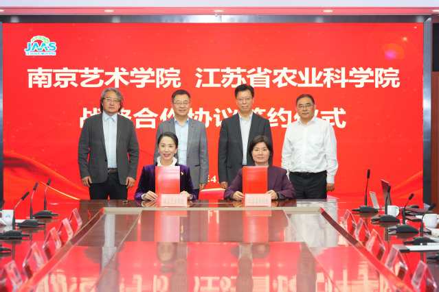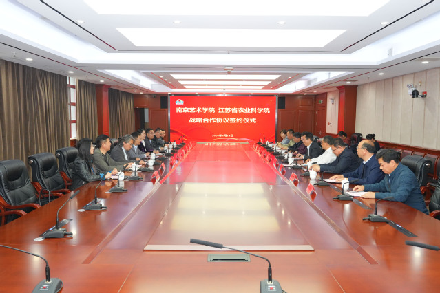 4月14日下午,南京艺术学院与江苏省农业科学院举行战略合作协议签约仪式。省农科院党委书记王克华、南艺党委书记俞锋出席仪式并讲话。省农科院党委委员、副院长王冉、党委副书记黄俊,党委委员、办公室主任苏国东,南艺党委常委、副校长张捷,副校长苗雨,党委常委、党校办主任、宣传部部长李志鹏参加仪式。